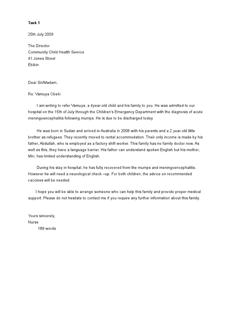 Test format and procedure the writing is. Oet writing general information writing time allocation 40 minutes. Do you have sample letter on how to refer back a patient to his family doctor. Centre number module (shade one box) There is no answer key for the writing paper, but there are sample answers and examiner comments on the relevant pages of the b2 first handbook.